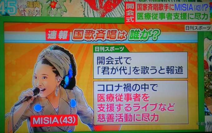 わーやばい。開会式の国歌斉唱misiaだ。国内最高の歌手を誘致できてよかったねほんと。 — kain (@blue_coma_x) july 22, 2021 Misiaの国歌斉唱がよかった ずっしりと歌い上げてた タップとジャズピアノ、守山未来ダンスは独特の世界観 海老蔵、衣装が。。。 無理せずもう少し軽めにしたらいいのに。重たすぎて表現が出来ずにいたよね? チョイチョイちらちら出る芸能人。 開会式の国歌斉唱が misiaで心底ホッとしている よかった…アイドルとかじゃ なくて — mi1213 (@mi12133) july 23, 2021. 歌手の misia が、8月14日に放送される日本テレビ系バラエティ番組『1億3000万人のshowチャンネル』 (毎週土曜21:00〜)で、バラエティ番組のロケに初挑戦する。 23日の東京オリンピック開会式では、国歌斉唱という大役を果たしたmisia。 東京五輪 2020が東京・国立競技場で開会し、歌手の misia が、国歌斉唱を務めた。 午後20時18分、 多様性 を象徴するレインボーのドレスに身をまとい登場したmisiaは、日本の国歌「 君が代 」を力強い声にのせて歌いあげた。